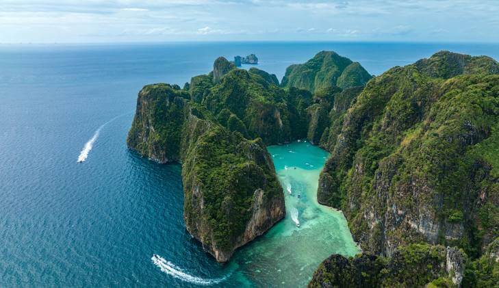 Highlights: Pi Leh Bay is a stunning lagoon surrounded by towering limestone cliffs and filled with clear blue-green water. Located on the island of Koh Phi Phi Leh, Pi Leh Bay is often visited as part of a boat tour around the Phi Phi Islands. For the best experience, try to visit during low tide in the early morning when the water colors are most vibrant and the crowds are minimal. Hiring a private boat is recommended to fully enjoy the bay at your own pace. The serene beauty of Pi Leh Bay will leave you mesmerized and is a must-see when visiting Thailand.